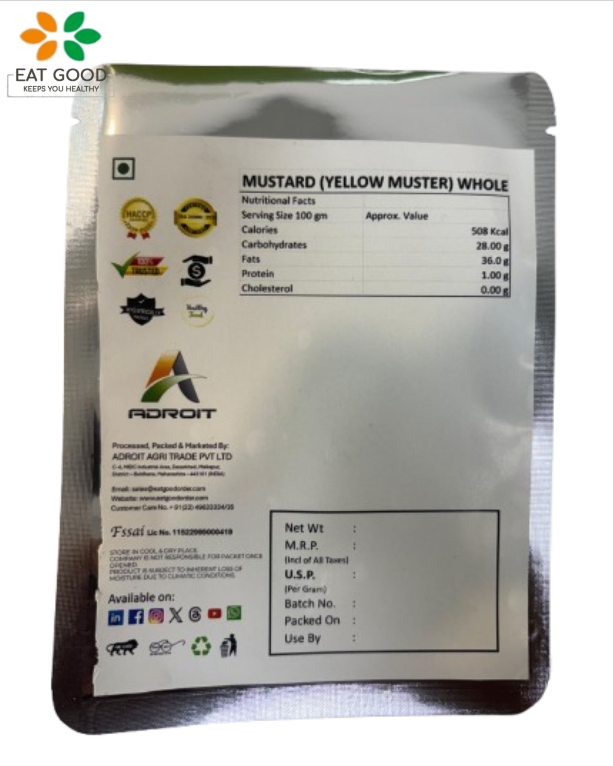 Adroit Eat Good Mustard Seeds (Yellow Mustard) are premium-quality seeds known for their mild heat, tangy flavor, and aromatic touch. Carefully sourced and hygienically packed, our yellow mustard seeds are perfect for adding a gentle kick to sauces, dressings, marinades, and pickling blends. A popular ingredient in both Indian and international cuisines, they enhance flavor without overpowering the dish. When ground or tempered, they release a zesty aroma that brings balance and brightness to a variety of culinary creations. Rich in natural oils and antioxidants, they also support digestion and wellness. Whether used whole, crushed, or in pastes, Adroit Eat Good Yellow Mustard Seeds deliver clean, mild flavor and quality you can trust.