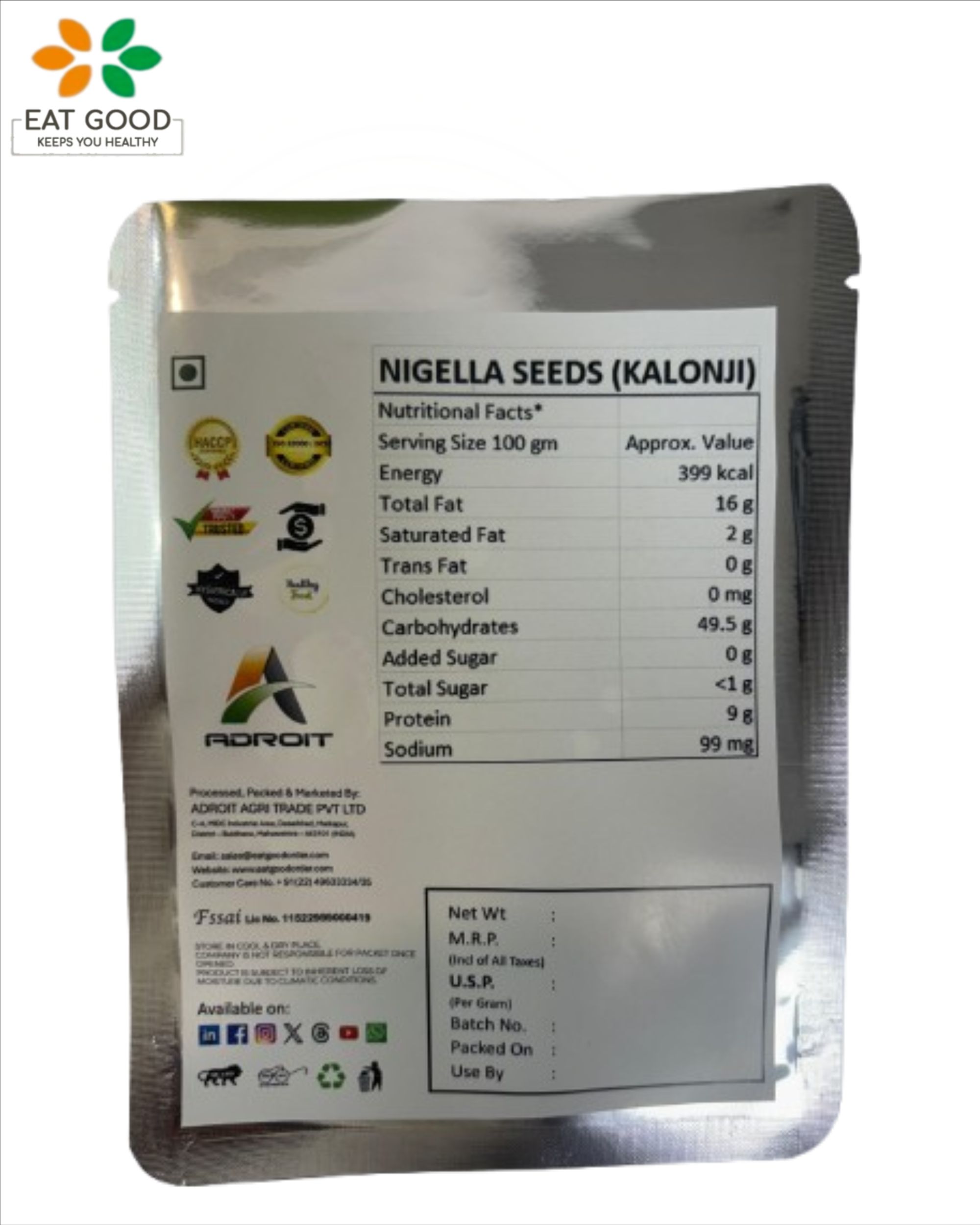 Adroit Eat Good Nigella Seeds (Kalonji) are premium-quality seeds prized for their bold, earthy taste and distinct peppery flavor. Sourced from trusted farms and hygienically packed, these aromatic seeds are perfect for seasoning Indian breads like naan and kulcha, adding depth to pickles, and enhancing the flavor of curries and lentils. With their rich aroma and slightly bitter undertone, Kalonji adds a unique and authentic touch to traditional Indian and Middle Eastern cuisines. Known for their antioxidant and digestive properties, they also contribute to wellness. Adroit Eat Good Nigella Seeds (Kalonji) is the ideal choice for home cooks and chefs who want to infuse their dishes with rich flavor and cultural authenticity.