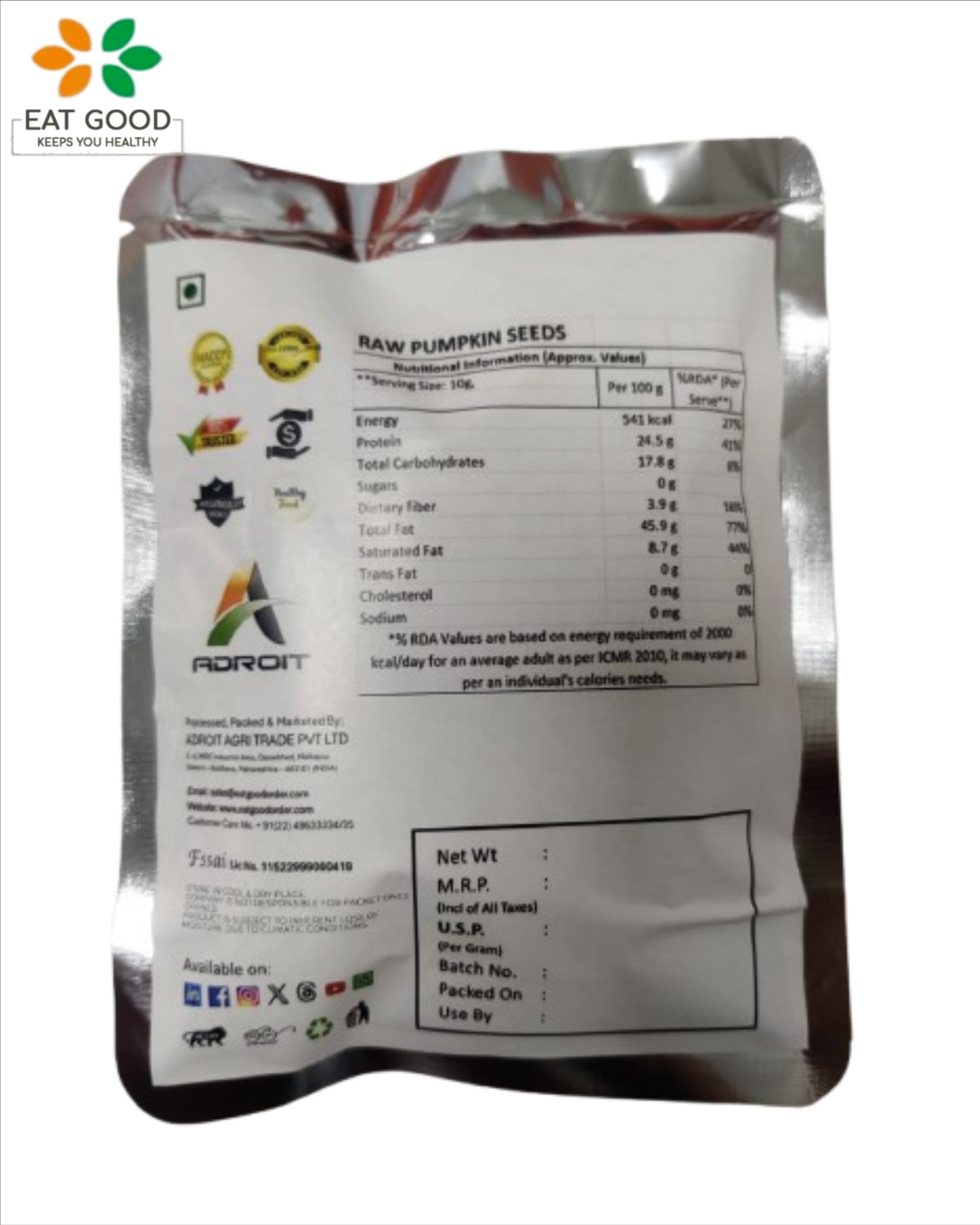 Adroit Eat Good Pumpkin Seeds are a premium, nutrient-rich superfood loaded with plant-based protein, magnesium, zinc, and powerful antioxidants. Known for their heart-healthy properties and immune-boosting benefits, these seeds also aid digestion and support overall wellness. Carefully sourced and hygienically packed, our pumpkin seeds are naturally gluten-free, non-GMO, and vegan-friendly—making them a smart choice for any health-conscious lifestyle. Enjoy them as a crunchy snack, sprinkle over salads, blend into smoothies, or use in baking and cooking. Adroit Eat Good Pumpkin Seeds are the perfect blend of taste and nutrition for anyone seeking a wholesome, energizing addition to their daily diet.