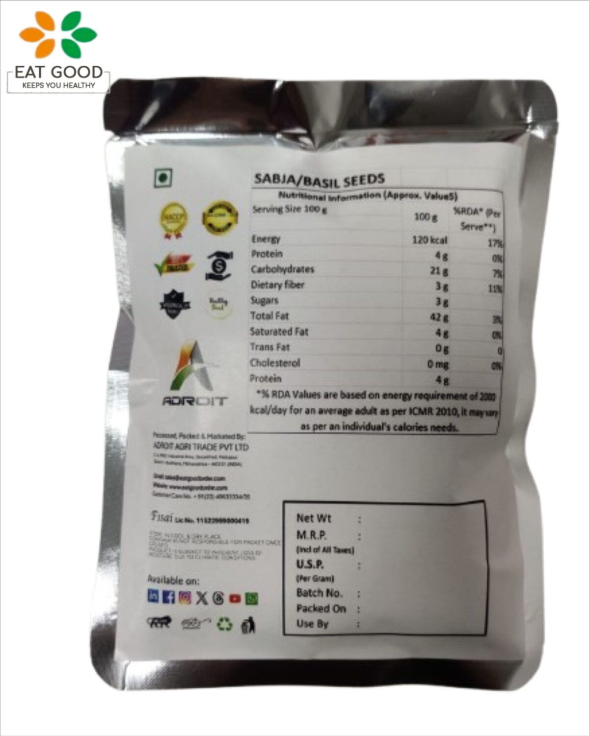 Adroit Eat Good Sabja Seeds (also known as Basil Seeds) are a powerful superfood packed with fiber, antioxidants, and essential nutrients. Known for their natural cooling properties and digestive benefits, sabja seeds help manage weight, control appetite, and support gut health. Sourced from premium quality crops and hygienically packed, these seeds swell beautifully when soaked, making them perfect for falooda, smoothies, detox drinks, and desserts. Naturally gluten-free, vegan, and non-GMO, Adroit Eat Good Sabja Seeds are the ideal addition to a healthy and balanced lifestyle. Add a refreshing and nutritious twist to your diet with every spoonful.