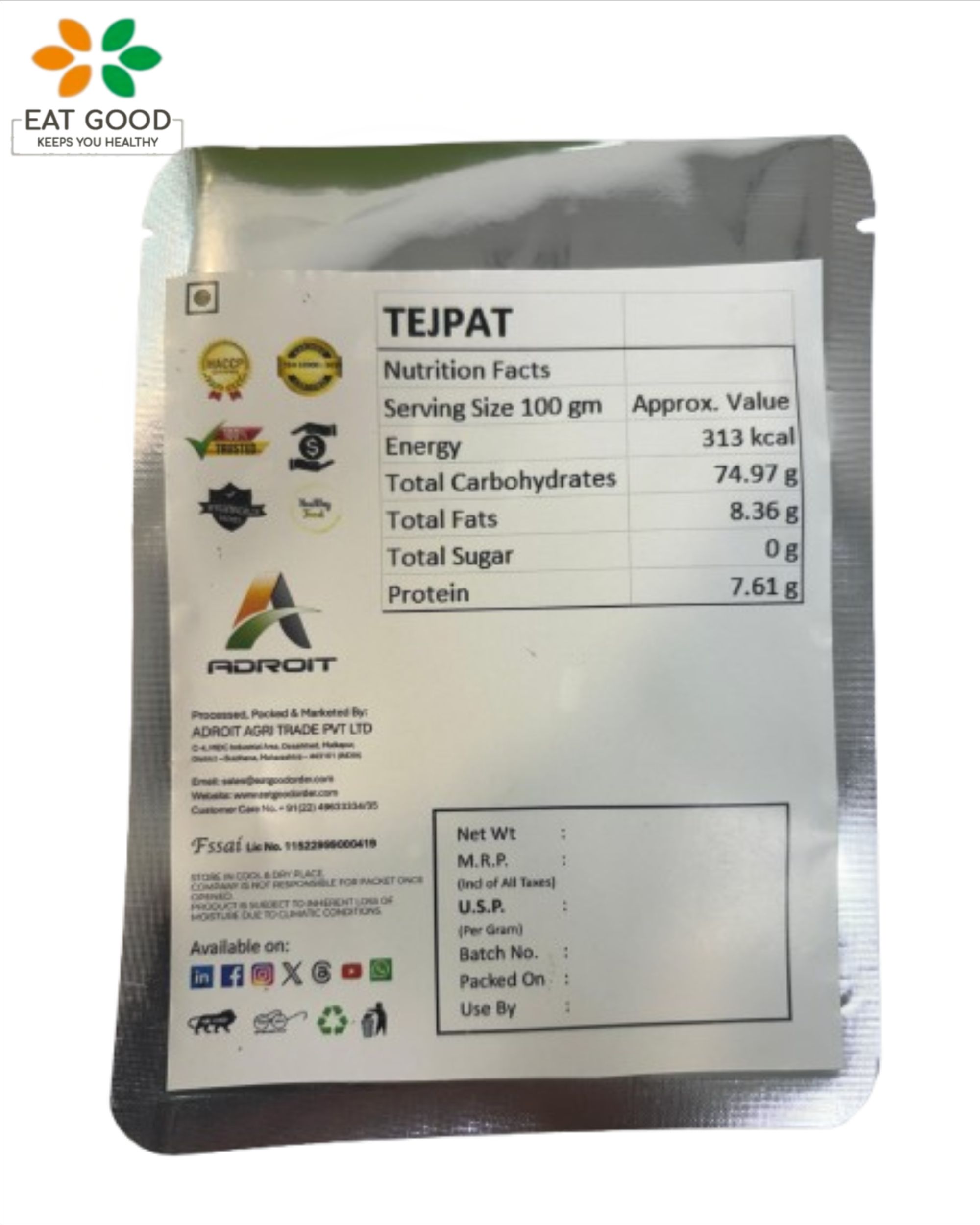 Adroit Eat Good Tejpata (Indian Bay Leaf) is a premium aromatic spice, hand-selected for its bold fragrance and earthy, slightly sweet flavor. Sourced from the finest bay leaves and hygienically packed, our Tejpata adds rich depth and subtle complexity to a variety of traditional and modern dishes. A key ingredient in Indian cuisine, itโs perfect for enhancing the flavor of curries, biryanis, stews, soups, and gravies. Whether used whole in slow-cooked meals or ground into spice blends, it delivers an authentic, layered taste experience. Naturally rich in essential oils and known for its digestive benefits, Adroit Eat Good Tejpata is a must-have for every spice rack.